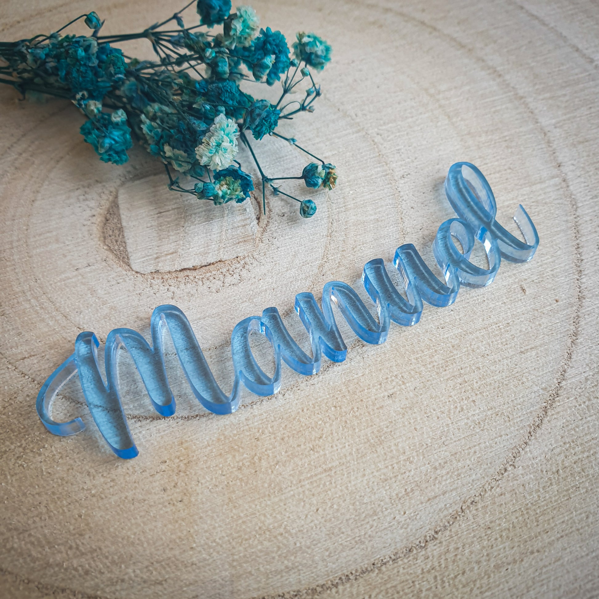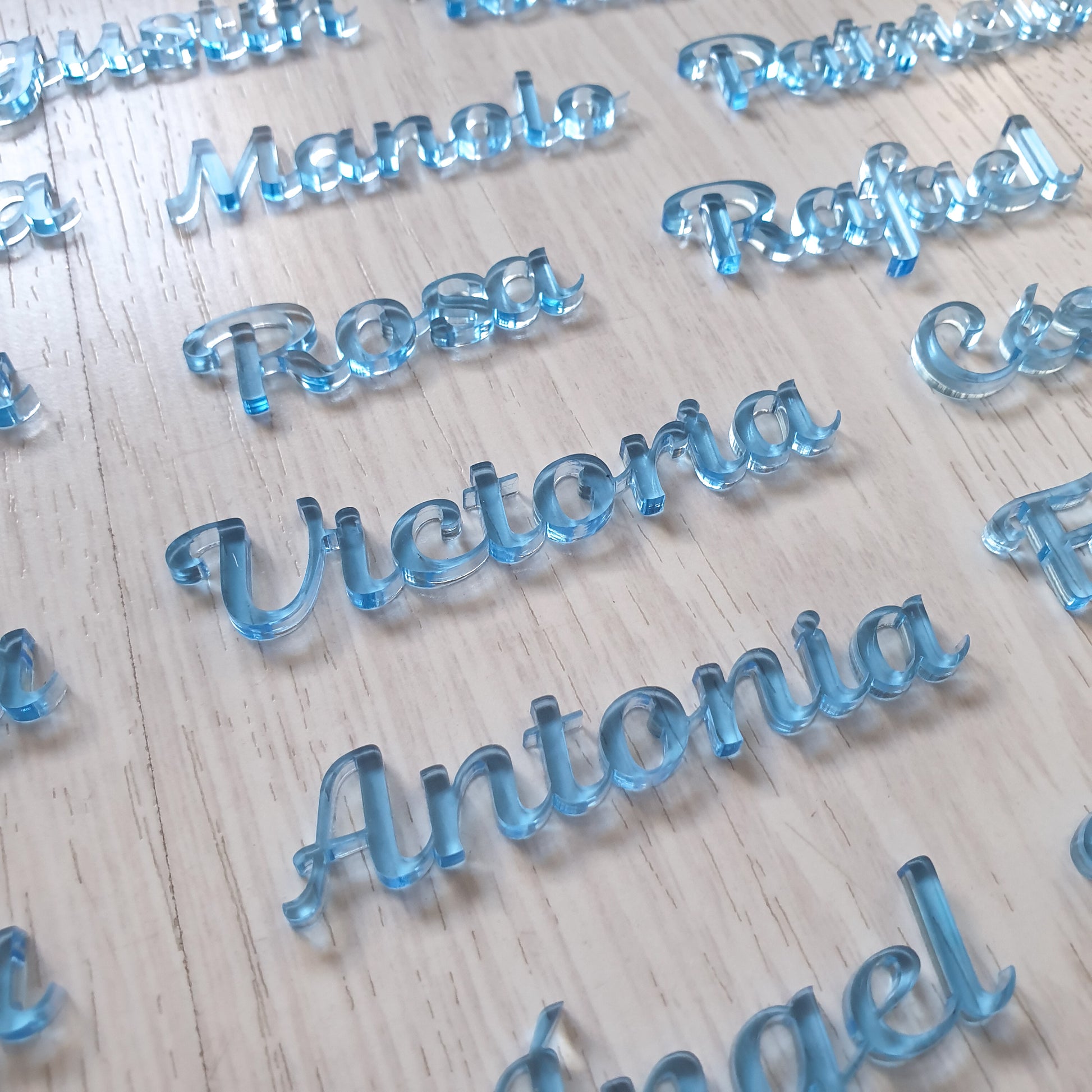 Los invitados se sorprenderán encontrando en su sitio su nombre en un precioso metacrilato que recuerda al azul hielo.