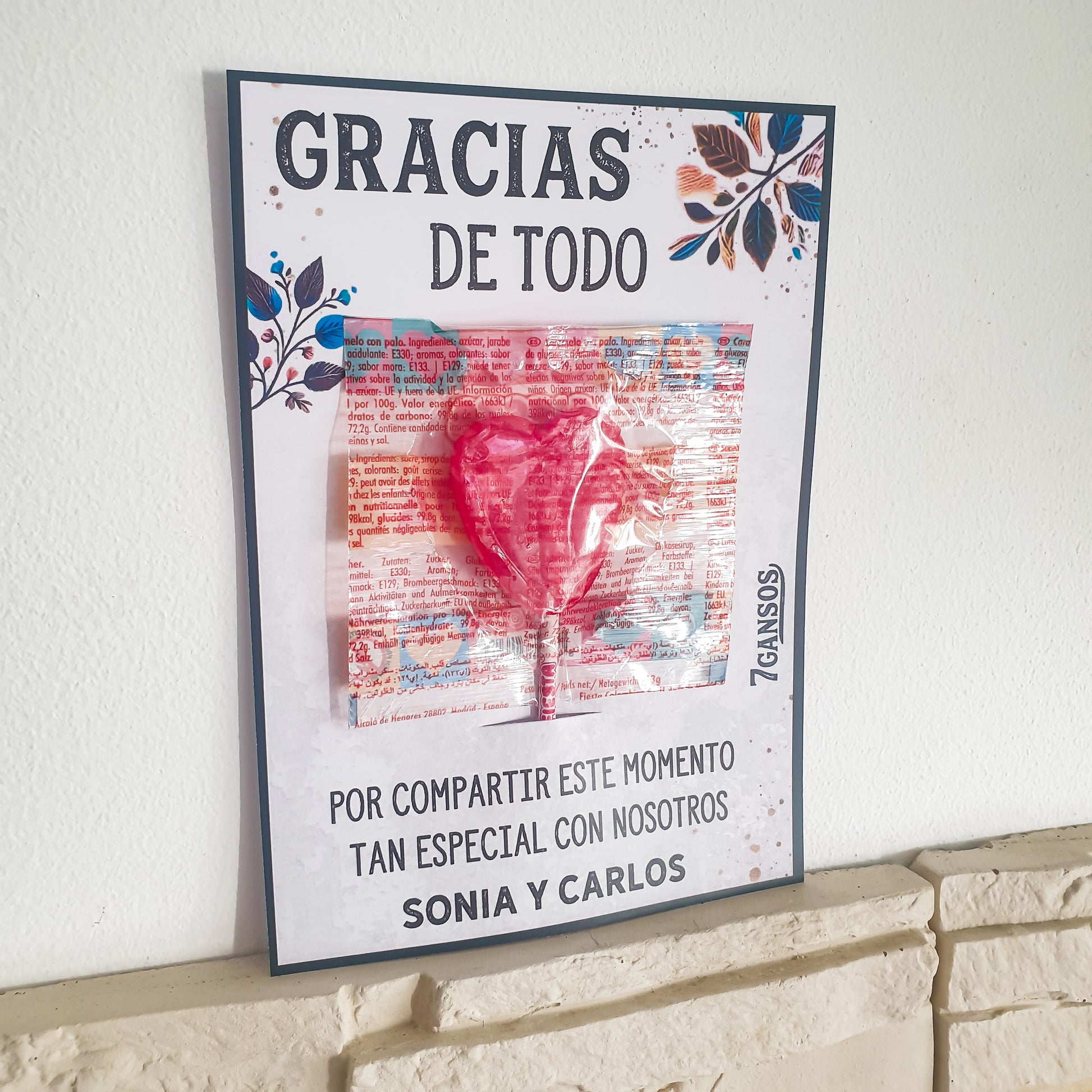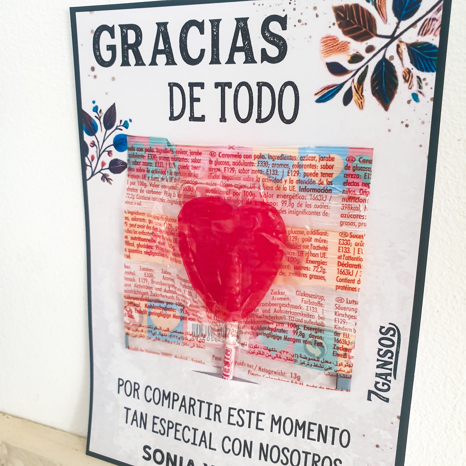 Las piruletas son de la marca "Fiesta", ¡las mejores! La postal mide 16x11,5 cm. Se emplean 10 días laborables en su realización (recíbelo en 11 días laborables) Si te urge más, sólo tienes que escribirnos.