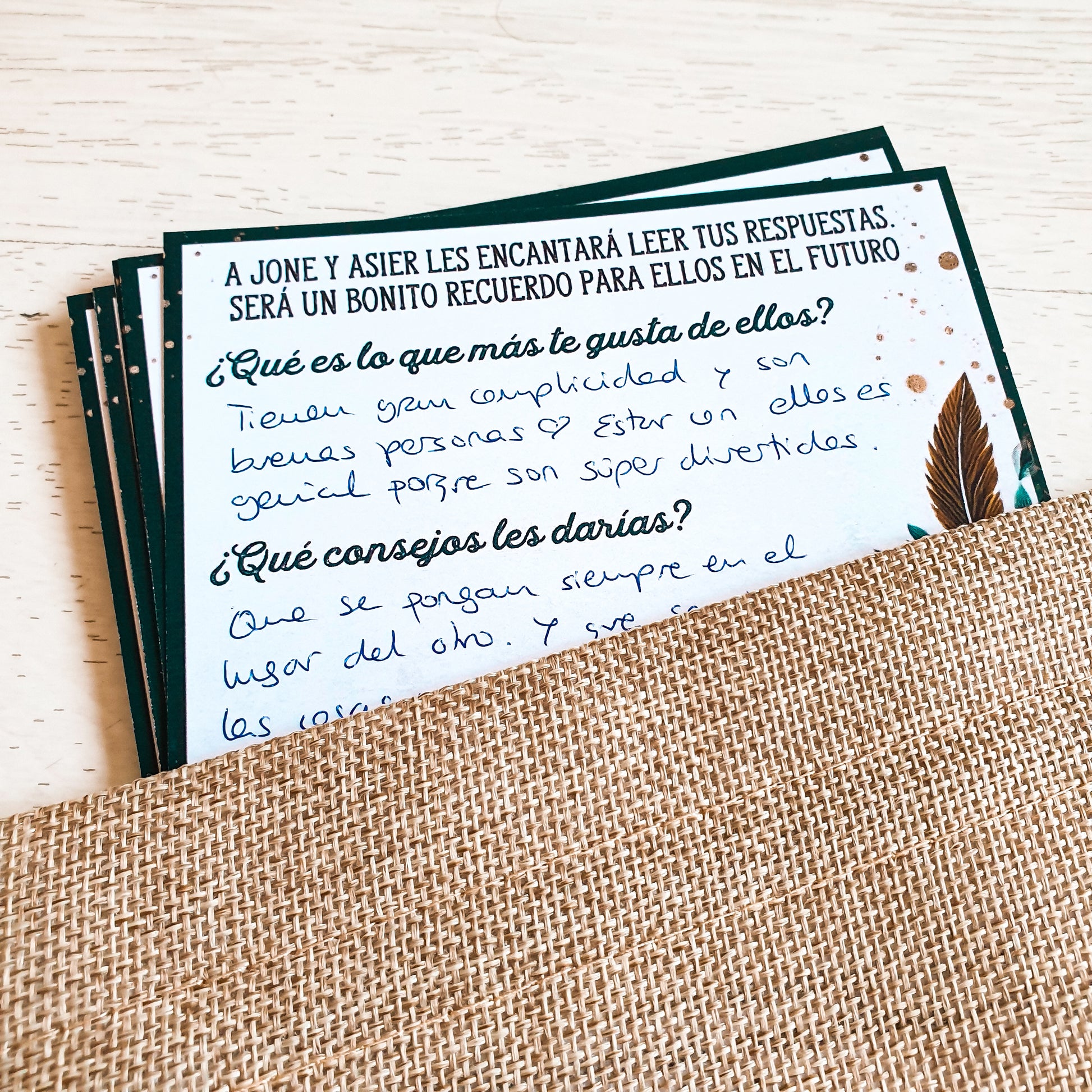Se reparten a los invitados en el postre por ejemplo para que las rellenen pensando en vosotros. No os imagináis la ilusión que os hará leerlas después!